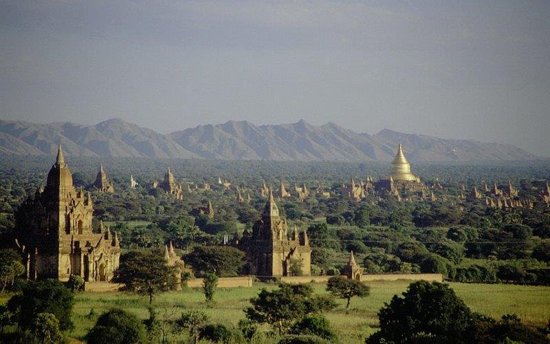 On the banks of the Irradwaddy River, a city with over 2,000 Buddhist temples, pagodas, and ruins, which are now a protected UNESCO World Heritage Site. (Actually over 10,000 were originally built, of which just over a 5th now remain).
