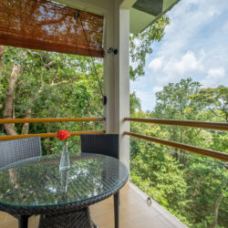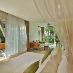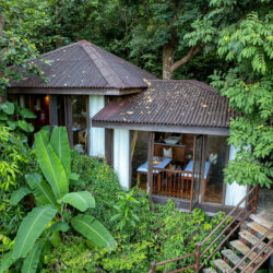 8 one-bedroom and one three-bedroom pool villas. Each has its own swimming pool, private garden, kitchenette in & out living spaces. The villas are located on a hilltop surrounded by rainforest and facing either sunrise or sunset sea views. They are essentially geared towards romance and couple focused. You will still see and hear nature around you.