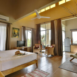 3 studio rooms, 3 Suites and 2 two-bedroom cottages. Deliberately rustic in style, comfortable yet with a real feeling of being at one with nature. The forest is literally surrounding you. They are reached by steep steps on a hillside, or a buggy will take you. You are asked to close and lock your doors to prevent wildlife from coming in.
