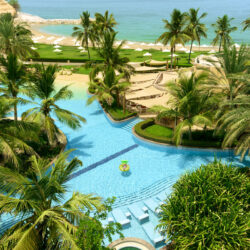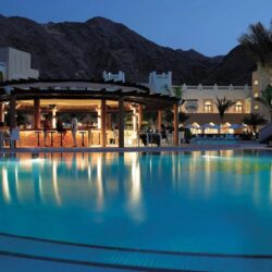 Shangri-La Barr Al Jissah Resort is built alongside a sheltered 500m beach with a high mountain backdrop. It is actually two distinct hotel buildings – Al Waha (The Oasis), which is on the southern side and is essentially family focused – both in the room style and on site facilities. It is the lowest priced of the various options, reflected in the room size.