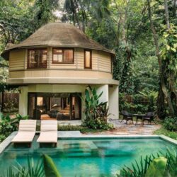 The majority are rondavel-style pavilions with a downstairs lounge area and upstairs bedroom. All are designed to blend seamlessly with the environment, surrounded by lush gardens, providing privacy and a sense of seclusion.