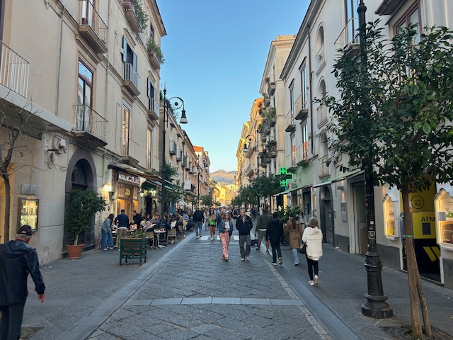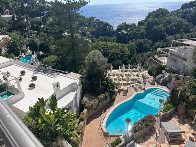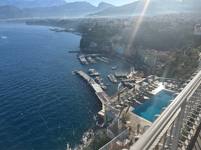 I totally enjoyed Sorrento; it is like Amalfi but maybe a level down in pricing. The town is lively, with atmospheric small streets full of tempting bar and restaurant options. We stayed at the Bel Air Hotel, which I liked a lot, and particularly the bedroom view out to the Vesuvius volcanic mountain, Pompeii and Naples on the horizon.