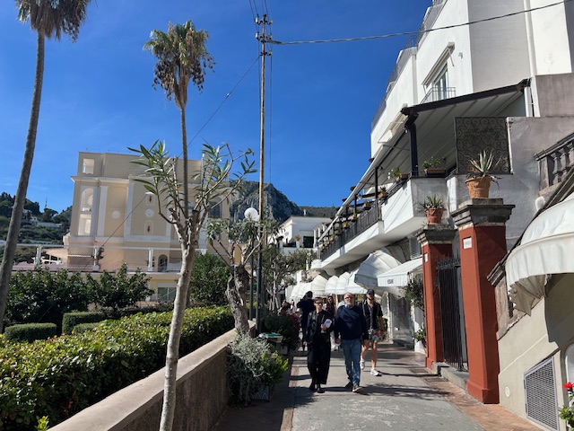 We eventually managed to take the 5-minute funicular lift from the port to the more central main town. Still mega busy, but as we walked south it became much less crowded. Suddenly it was all rather attractive and top quality. As the bird flies (not sure they have crows in Capri), it would only take about 7 minutes to fly across the island, but we humans have to go up and down, so it takes about 30 minutes, including the lift. But very different worlds – reflected in the prices.